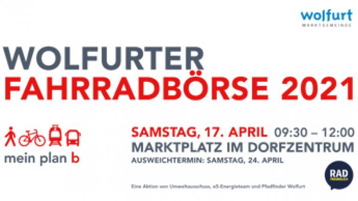 Am Samstag den 17. April organisieren Pfadfinder, Umweltausschuss und e5-Energieteam am Marktplatz im Dorfzentrum von 09:30 bis 12:00 Uhr die traditionelle Wolfurter Fahrradbörse.