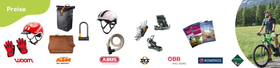 Preise: Fahrradkarten von Kompass, Lonely Planets Bücher, Thalia Gutscheine, KTM Trekkingräder und Hotelgutscheine von 50plus Hotels.