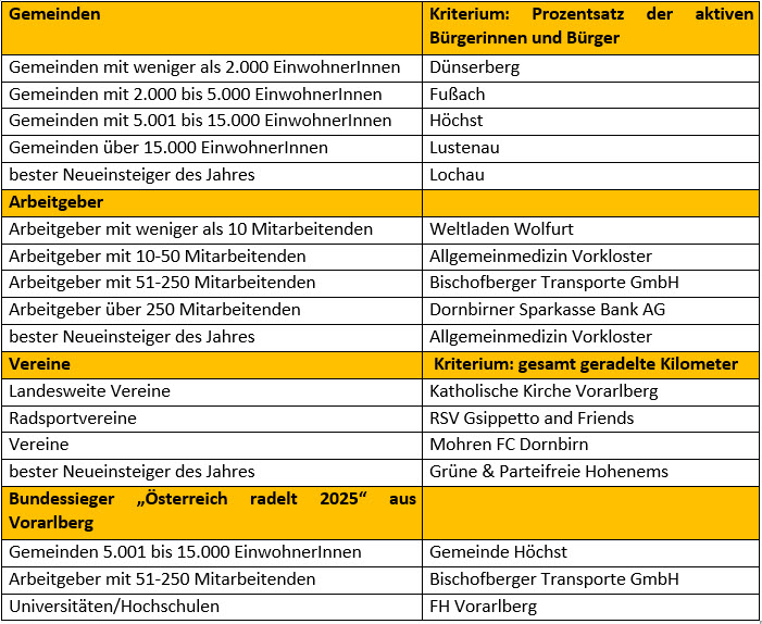 „Ich bedanke mich bei den 59 Vorarlberger Gemeinden, 198 Unternehmen, 21 Schulen und 52 Vereinen, die uns dabei unterstützen, möglichst viele Vorarlbergerinnen und Vorarlberger zum Radfahren zu motivieren“, betonte Christof Bitschi. 2025 waren 30 Arbeitgeber, 2 Gemeinden und 11 Vereine „Neueinsteiger“ bei „Vorarlberg radelt“ und damit zum ersten Mal bei der Aktion mit dabei.